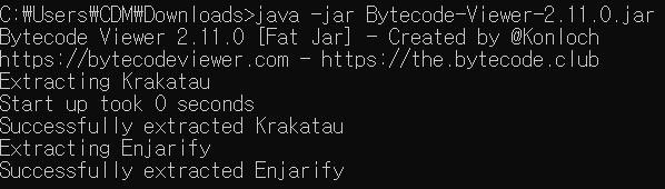 jar 파일을 다운로드 후, 설치경로에서 명령어(java -jar Bytecode-Viewer-2.11..0 jar) 입력하면 bytecodeviewer가 실행됨