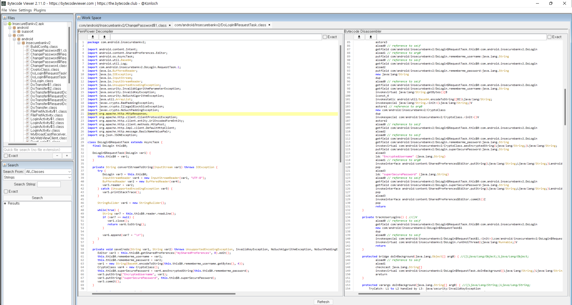 BytecodeViewer는 안드로이드 뿐만 아니라, 자바, DEX, jars 파일 등과 같은 소스코드 리버싱 분석 도구. 윈도우 환경에서도 완벽하게 동작하며, 안드로이드 APK 파일을 디컴파일하여 바이트코드 형태와 클래스 파일을 자바 파일로 변환한 후 소스파일로 복원하여 함께 보여줌. 앞서 소개한 도구들의 기능을 모두 합한 것과 같아서 효율적인 도구이며, 분석 속도가 매우 빠름.