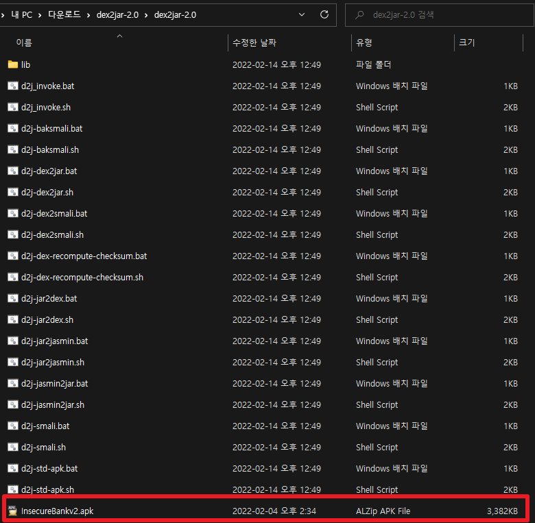 dex2jar를 이용할 땐, 디컴파일할 파일을 다운로드 받은 dex2jar 폴더 내로 이동시켜주어야 함
